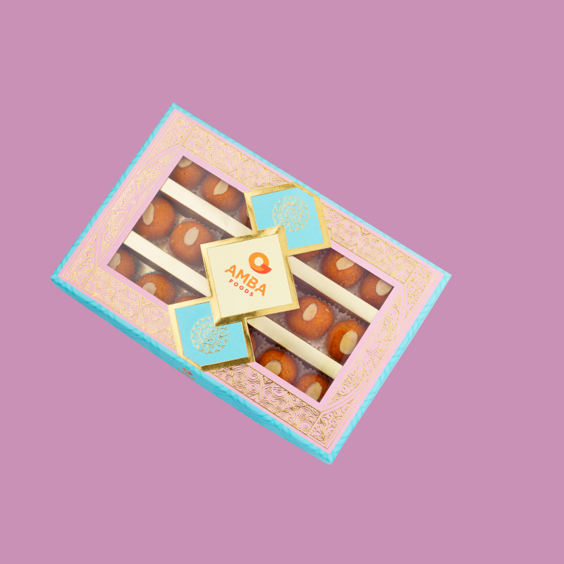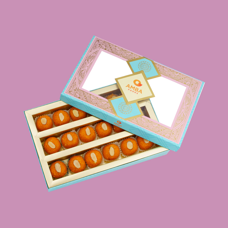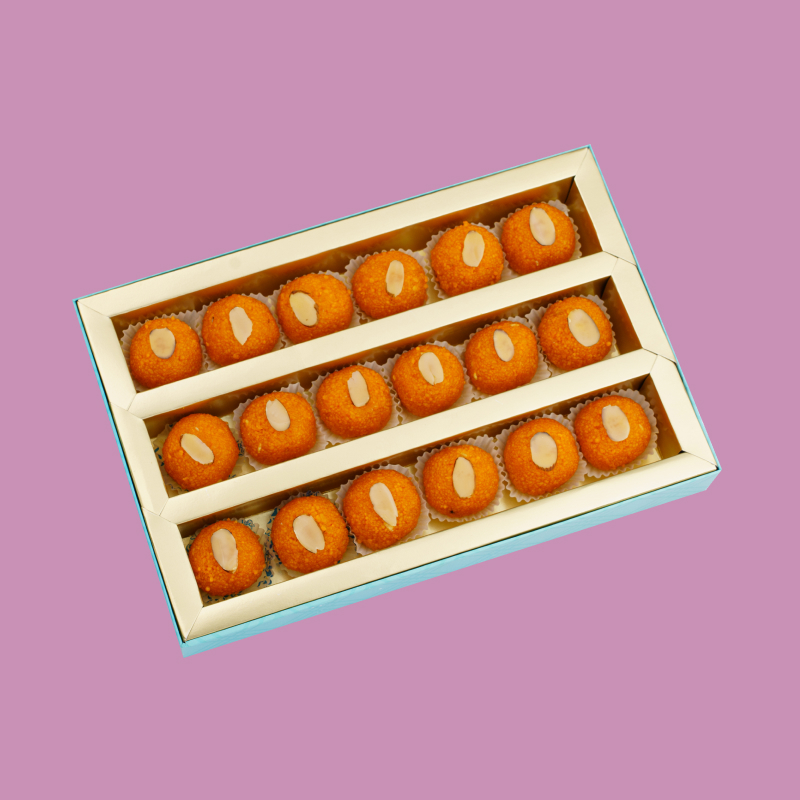 Experience the rich, golden delight of Motichoor Ladoo. Crafted with tiny gram flour pearls, these sweet orbs are drenched in syrupy goodness, making them a favorite across generations. A true embodiment of festive joy.If you’d like to create giftt boxes with our other range of sweets and savouries, please contact us.